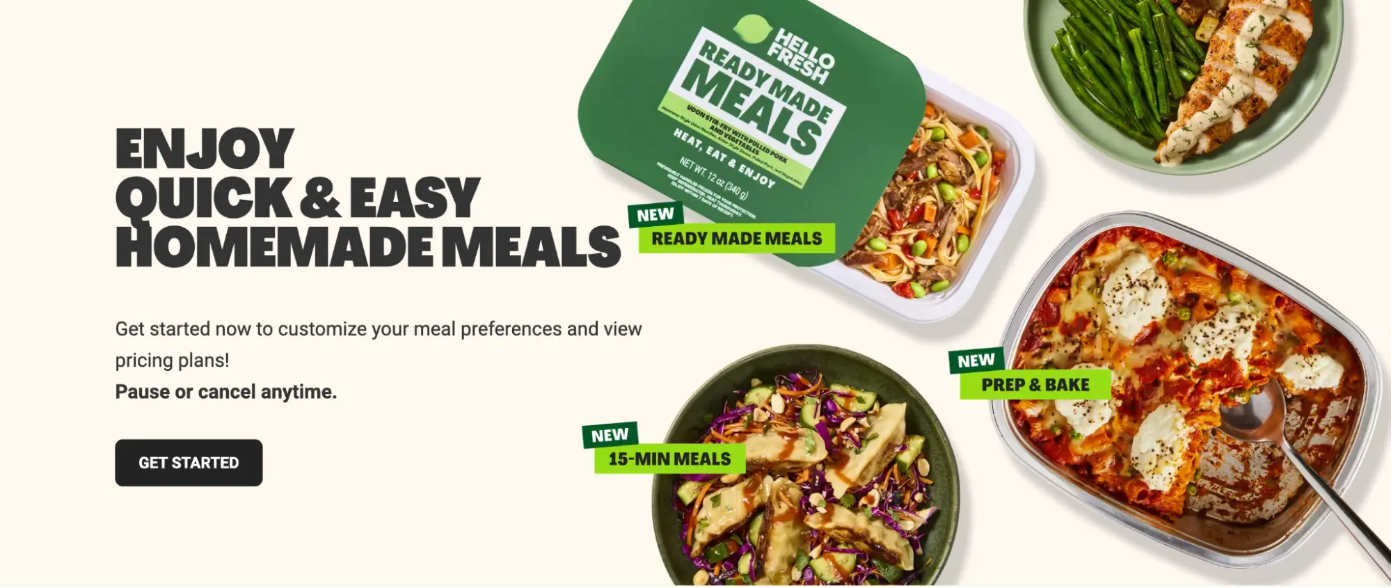The rest of the click-through page describes how HelloFresh operates, lists the main benefits, and shares top reviews. It also includes a second CTA button at the bottom of the page, aimed at the same conversion goal.