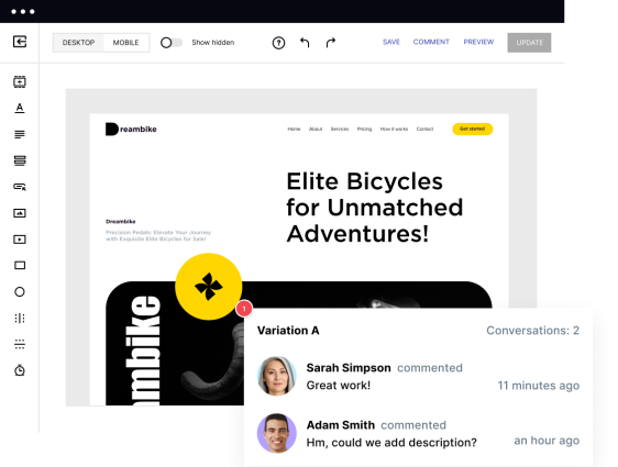 Instapage keeps teams aligned with live commenting, version history, and approvals. Updates to CTAs, pricing, or headers apply across your workspace automatically, helping you move faster with fewer errors.
