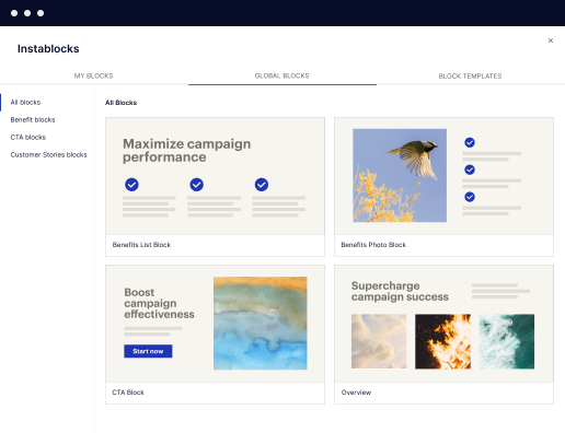 Instapage helps you scale from one site to hundreds of campaign pages: start with 200+ optimized templates, reuse and update sections instantly with Instablocks and Global Blocks, and increase relevance with Dynamic Text Replacement, ad-to-page personalization, and Collections.